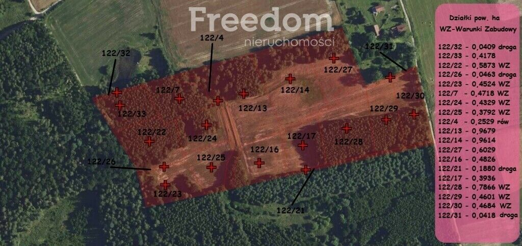 122/32 pow. 0,0409 ha - droga, 122/22 pow. 0,5873 ha wydane WZ, 122/33